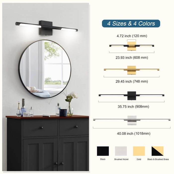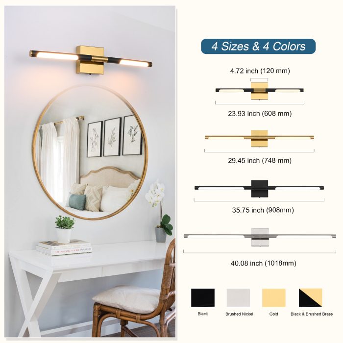 High-Quality & Minimalist Design: This modern bathroom vanity light combines premium craftsmanship with simple elegance, making it a stylish addition to any bathroom or dressing space. Available in Black & Brushed Brass, Black, Gold, and Brushed Nickel, it fits seamlessly into both contemporary and classic interiors while ensuring long-lasting performance with ETL-certified safety.