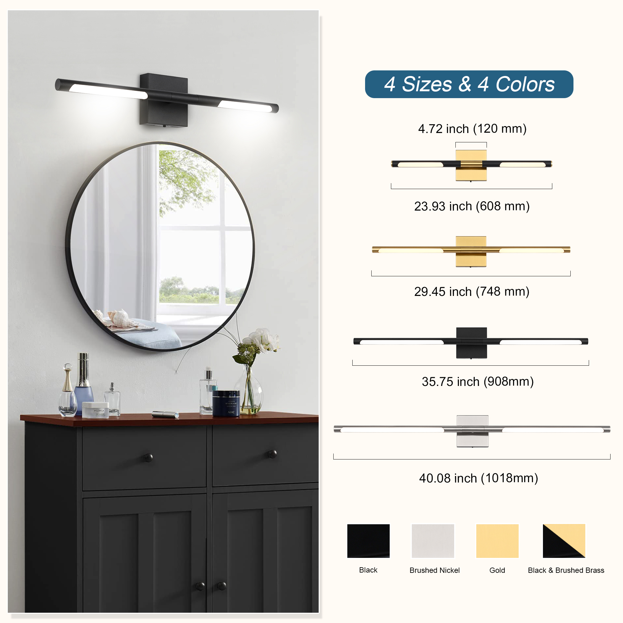 Elevate your bathroom with this modern LED vanity light, available in Black & Brushed Brass, Black, Gold, and Brushed Nickel. Featuring 5 selectable color temperatures, 360° rotatable light tubes, and flicker-free illumination (CRI>90), it delivers both beauty and performance. Choose from 24″, 30″, 36″, or 40″ sizes to perfectly match your mirror.