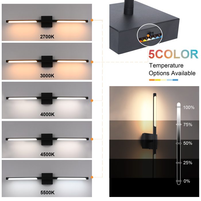 Selectable Color Temperature: Easily adjust your ambiance with 5 color temperature options — 2700K (Warm White), 3000K, 4000K (Neutral White), 4500K, and 5500K (Cool White). Simply slide the side button on the fixture base to choose your preferred lighting tone for any occasion.