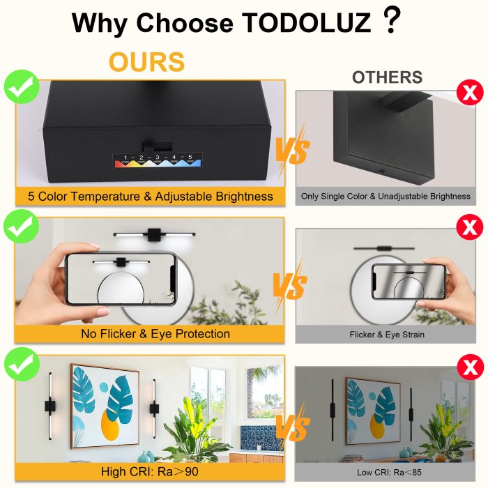 Flicker-Free & True Color Lighting: With a CRI >90, this LED vanity light offers vibrant, true-to-life color rendering and reduces eye strain — perfect for daily grooming or makeup application. It ensures even, flicker-free illumination that enhances both clarity and comfort.