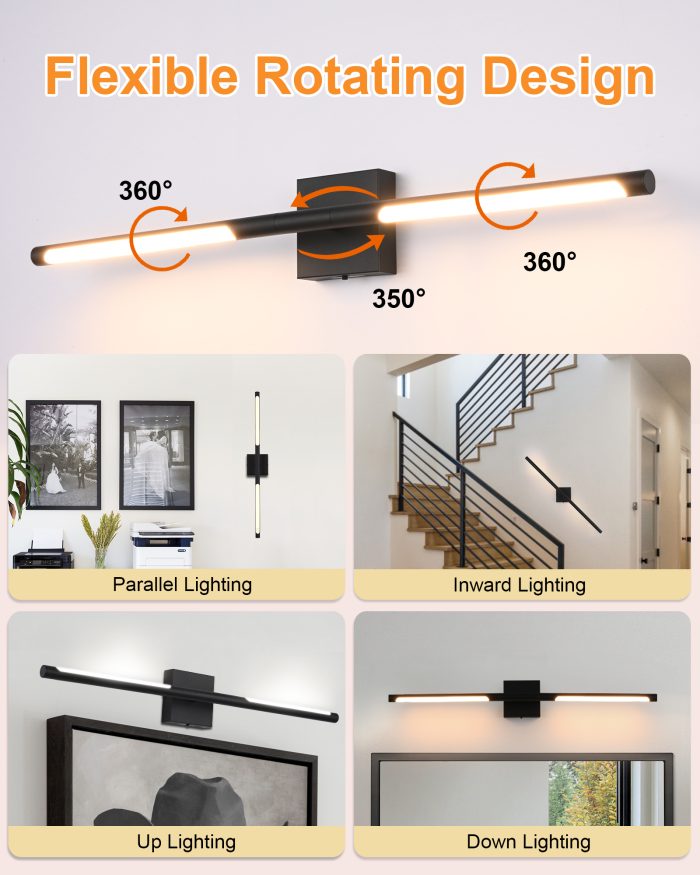 360° Adjustable Light Tubes: The flexible dual-tube design allows each light bar to rotate 360°, enabling you to customize illumination angles for your vanity area or wall décor. Whether uplighting or downlighting, it provides precise and artistic control of brightness and direction.